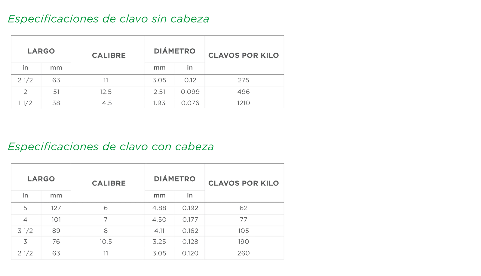 Diseñados para la industria de la construcción y fabricados bajo un proceso de trefilado de alambrón, con la más alta tecnología, y usando alambrón de alta calidad como materia prima. Primero detallamos el calibre deseado de los clavos; posteriormente, pasan a una máquina que los corta a la medida requerida, dándole forma a la cabeza y a la punta; y finalmente, se les somete a una esmerada limpieza que los deja listos para su aplicación.