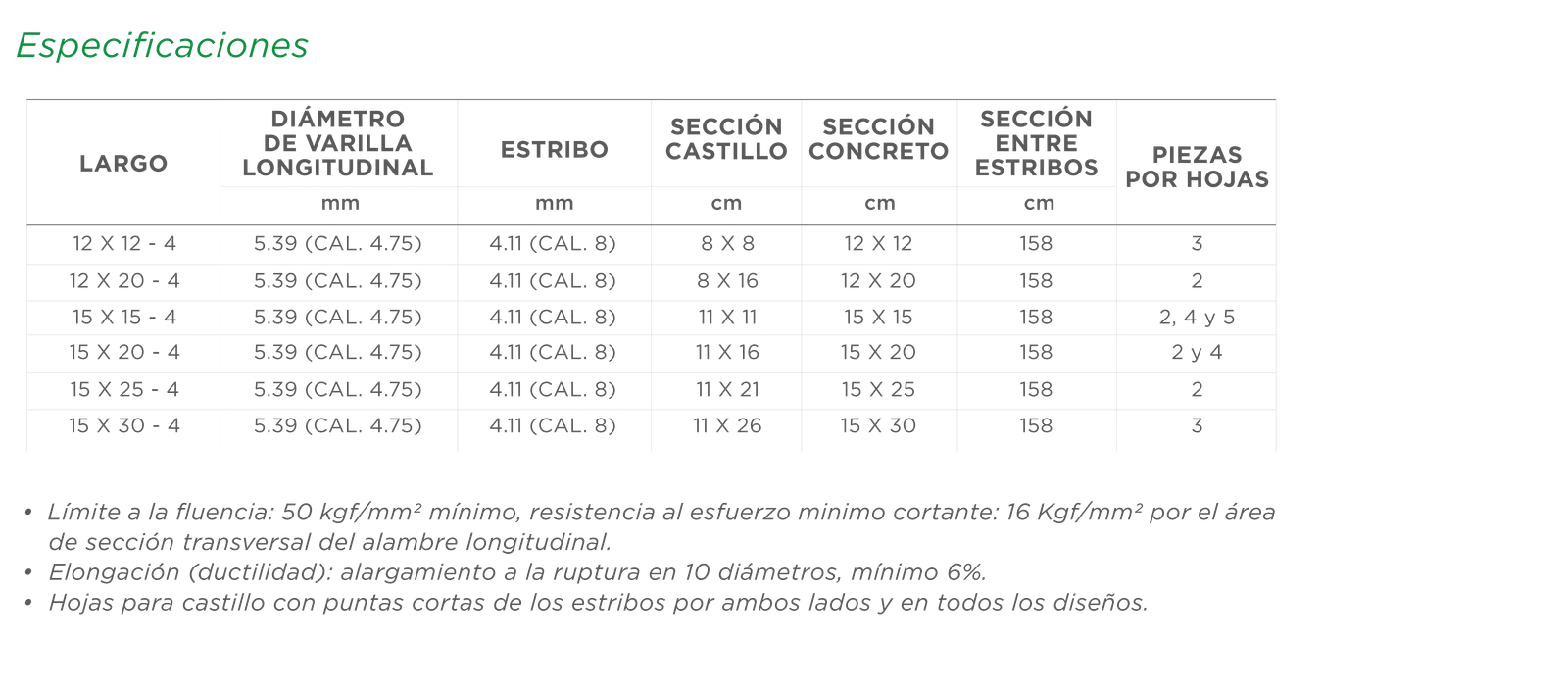 La hoja para castillo es un elemento estructural, utilizado para el refuerzo de elementos de concreto que confinan muros de mampostería, dalas y castillos. Se fabrican con tres o cuatro varillas (alambres); formando, según sea el diseño, secciones triangulares, cuadradas o rectangulares, con estribos perpendiculares lisos o corrugados, y electrosoldados al refuerzo longitudinal. Para la fabricación de este producto se utiliza la más avanzada tecnología, así como alambrón de calidad internacional como materia prima; el cual es laminado en frío, lo que le permite ofrecer una mayor resistencia a la tensión.