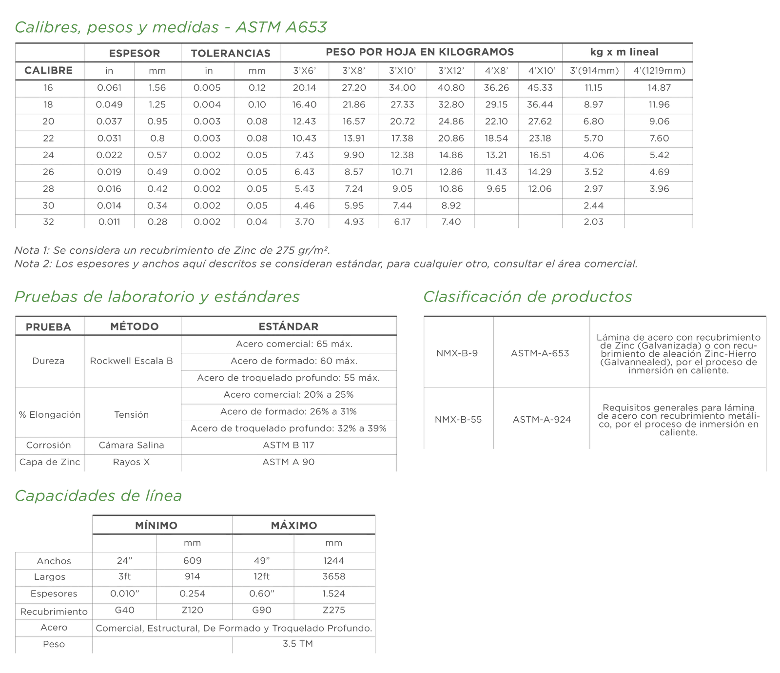 • Calibres del 16 al 32 y anchos de 914 mm (36”) y 1219 mm (48”).