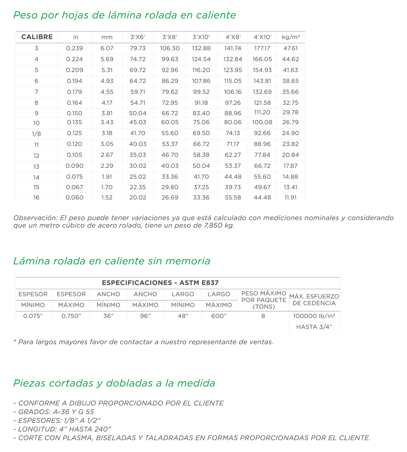 Para diversas aplicaciones, con un extenso surtido en diferentes dimensiones y grados de acero; cumpliento con los más altos requisitos de longitud, planeza, escuadre y acabado superficial. Con una amplia capacidad para procesar materiales de diversos anchos, de hasta de 8 pies; y cortes especiales, según las necesidades del cliente, hasta por 60 ft.