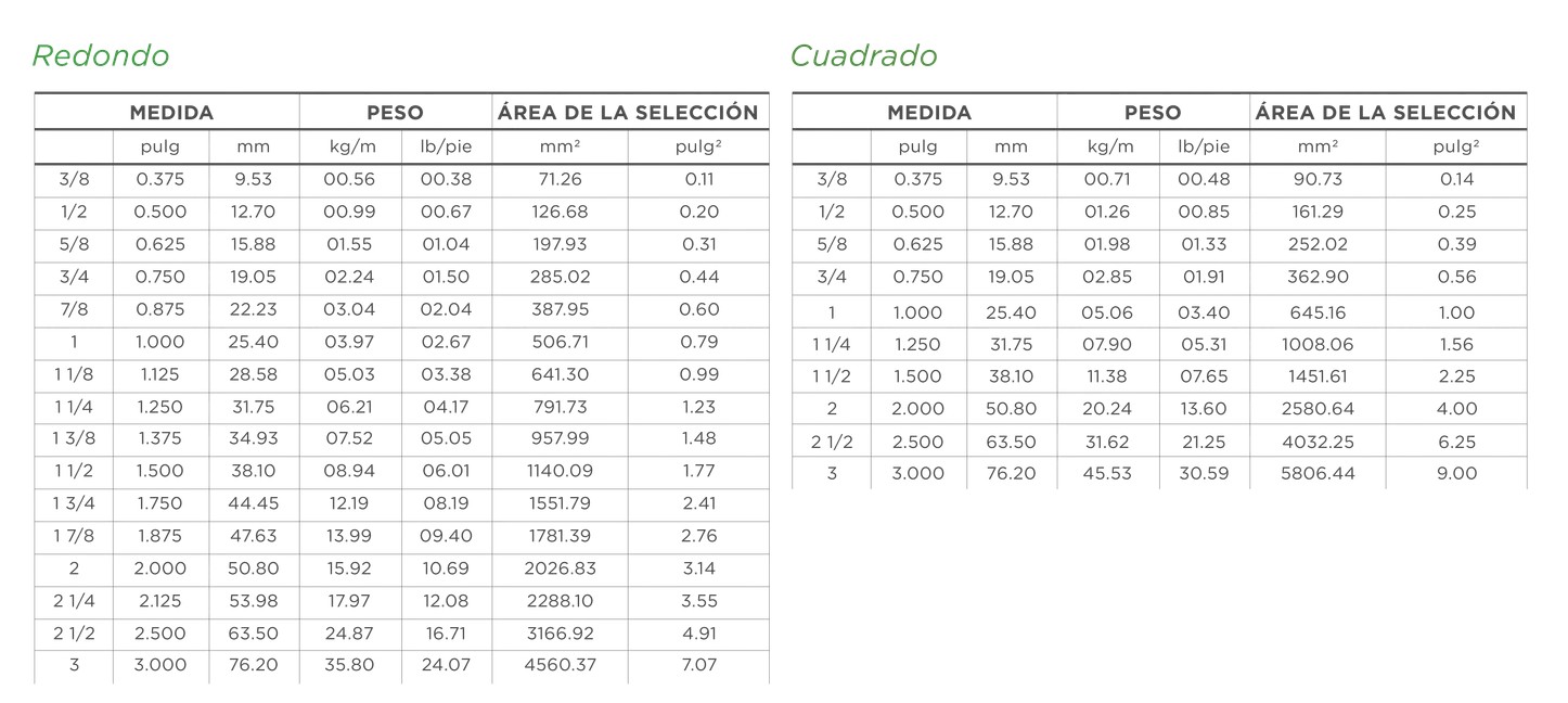 (Tomar solo como referencia) El peso está calculado con mediciones nominales normales y considerando que un metro cúbico de acero rolado tiene un peso de 7,850 kg.