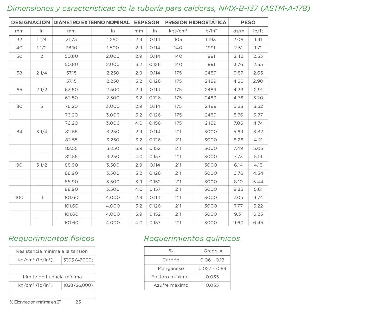 Tubería de acero con soldadura longitudinal, fabricada por el método de reducción en caliente; con el cual adquiere las condiciones requeridas por el estándar nacional NOM-B-137 y el internacional ASTM-A-178. Con soldadura normalizada, además es sometido a pruebas no destructivas, tales como: UT, corrientes Eddy y prueba hidrostática, que aseguran su calidad.